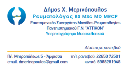 customer tabsΕπικοινωνίαΟ Ρευματολόγος Δήμος Χ. Μερινόπουλος αποφοίτησε από την Ιατρική Σχολή του Πανεπιστημίου Κρήτης (2010) και ειδικεύτηκε στην Εσωτερική Παθολογία και Ρευματολογία στο Ηνωμένο Βασίλειο (2011-2021) με εξειδίκευση στο υπερηχογράφημα μυοσκελετικού. Διατηρεί ιδιωτικό Ιατρείο στην Άμφισσα και είναι επιστημονικός συνεργάτης στη Μονάδα Ρευματολογίας και Κλινικής Ανοσολογίας του Πανεπιστημιακού Γενικού Νοσοκομείου "ΑΤΤΙΚΟΝ". Είναι μέλος του General Medical Council (Specialist Register) του Ηνωμένου Βασιλείου, της Βρετανικής Ρευματολογικής Εταιρείας (British Society for Rheumatology), του Ιατρικού Συλλόγου Άμφισσας, της Ελληνικής Ρευματολογικής Εταιρείας και της ελληνικής ομάδας εκπαίδευσης Ρευματολόγων στο υπερηχογράφημα μυοσκελετικού, ΜΙΤΟΣ.Ο ιατρός δέχεται κατόπιν ραντεβού, ώρες λειτουργίας 8:00 - 13:00 και 18:00 - 20:00 καθημερινά εκτός Τετάρτης, Σαββάτου και Κυριακής.Ρευματοειδής αρθρίτιδαΟστεοαρθρίτιδαΟστεοπόρωσηΨωριασική αρθρίτιδαΑγκυλοποιητική σπονδυλαρθρίτιδαΟσφυαλγίαΙσχιαλγίαΠόνοςΣυστηματικός ερυθηματώδης λύκοςΥπέρηχος μυοσκελετικού ΡευματολόγοιΥγείαΡήγα Κοντορήγα Ευθ, Γιδόγιαννου 7, Άμφισσα 331 00Πανεπιστημιακό Γενικό Νοσοκομείο "Αττικόν", Ρίμινι 1, ΧαϊδάριΝΑΥΠΑΚΤΟΣ ΑΙΤΩΛΟΑΚΑΡΝΑΝΙΑΣΣΤΕΡΕΑ ΕΛΛΑΔΑΑΙΤΩΛΟΑΚΑΡΝΑΝΙΑ 2265072501 6988281948dmerinopoulos@gmail.com Το προτείνω (έχει προταθεί 1 φορές) ΦωτογραφίεςFacebook LikeShare on FacebookTweet Widget