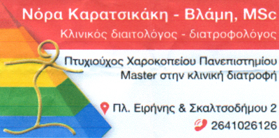 customer tabsΕπικοινωνίαΚλινικός Διαιτολόγος - ΔιατροφολόγοςΔέχεται Δευτέρα - Τρίτη - Πέμπτη - Παρασκευή Κατόπιν ΡαντεβούΗ κα Νόρα Καρατσικάκη-Βλάμη είναι απόφοιτος του Χαροκοπείου Πανεπιστημίου Αθηνών από το 2007. Διετέλεσε την πρακτική της άσκηση σε νοσοκομεία της πρωτεύουσας και από το 2007 διατηρεί το δικό της διαιτολογικό γραφείο. Παράλληλα έχει παρακολουθήσει πλήθος συνεδρίων και σεμιναρίων με στόχο τη συνεχή επιμόρφωση και εξέλιξή της. Έχει παρουσιάσει θέματα διατροφής και παχυσαρκίας σε συλλόγους και σε αρκετά σχολεία της πόλης. Έχει διδάξει στο δημόσιο ΙΕΚ Αγρινίου το μάθημα της Διατροφής, όπως επίσης έχει παραδώσει εθελοντικά μαθήματα στον Ελληνικό Ερυθρό Σταυρό. Ταυτόχρονα, το 2013 τελειώνει τη μεταπτυχιακή της διατριβή στο Χαροκόπειο Πανεπιστήμιο ειδικευόμενη πλέον στον τομέα της Κλινικής Διατροφής. Η επιτυχία τιυ γραφείου της στηρίζεται στην εξατομικευμένη εφαρμογή του μοντέλου τροποποίησης διατροφικής συμπεριφοράς και ελέγχου βάρους, το οποίο προσαρμόζεται πλήρως στις ιδιαίτερες ανάγκες και τον τρόπο ζωής του καθενός. Παρέχονται υπηρεσίες υψηλής ποιότητας στις καλύτερες τιμές, προσαρμοσμένες στα δεδομένα της εποχής.Έλεγχος και μείωση σωματικού βάρουςΕπιτυγχάνεται μέσω εξατομικευμένων διαιτολογίων με την εκτίμηση ιατρικού και διατολογικού ιστορικούΑπώλεια λιπώδους μάζας / λίπουςΑξιολογείται με λιπομέτρηση το λίπος, τα υγρά και η μυϊκή μάζα, συνολικά αλλά και στα επιμέρους τμήματα του σώματοςΔιαιτολογική υποστήριξη για νοσήματαΚαρδιαγγειακά, υπερλιπιδαιμίες, υπερχοληστερολαιμίες, υπέρταση, σακχαρώδης διαβήτης, γαστρεντερικά προβλήματα κ.λπ.Μέτρηση βασικού μεταβολικού ρυθμού (BMR) και αξιολόγησή τουΑργός, φυσιολογικός ή γρήγορος μεταβολισμόςΔιατροφή στα διάφορα στάδια της ζωήςΒρεφική, παιδική, εφηβική και 3η ηλικίαΔιατροφική υποστήριξη σε αθλητές Ειδική διατροφή σε εγκυμοσύνη & θηλασμό Διαιτολόγοι - ΔιατροφολόγοιΥγείαΠλ. Ειρήνης & Σκαλτσοδήμου 2, Αγρίνιο, ΑιτωλοακαρνανίαΑΓΡΙΝΙΟ ΑΙΤΩΛΟΑΚΑΡΝΑΝΙΑΣΑΙΤΩΛΟΑΚΑΡΝΑΝΙΑΣΤΕΡΕΑ ΕΛΛΑΔΑ 2641026126 6945573606noravlami@gmail.comhttps://www.facebook.com/nora.karatsikaki.vlami Το προτείνω (έχει προταθεί 0 φορές) ΦωτογραφίεςFacebook LikeShare on FacebookTweet Widget