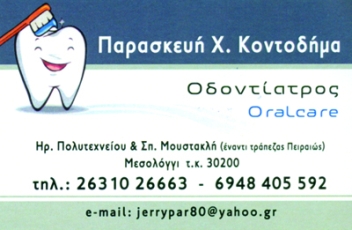 customer tabsΕπικοινωνίαΔέχεται καθημερινά 09:30 -17:30 εκτός ΠαρασκευήςΠαρασκευή 09:30-15:30 με ραντεβούΧειρουργοί ΟδοντίατροιΥγείαΗρ. Πολυτεχνείου & Σπ. Μουστακλή, ΜεσολόγγιΜΕΣΟΛΟΓΓΙ ΑΙΤΩΛΟΑΚΑΡΝΑΝΙΑΣΑΙΤΩΛΟΑΚΑΡΝΑΝΙΑΣΤΕΡΕΑ ΕΛΛΑΔΑ 2631026663 6948405592jerrypar80@yahoo.gr Το προτείνω (έχει προταθεί 0 φορές) ΦωτογραφίεςFacebook LikeShare on FacebookTweet Widget