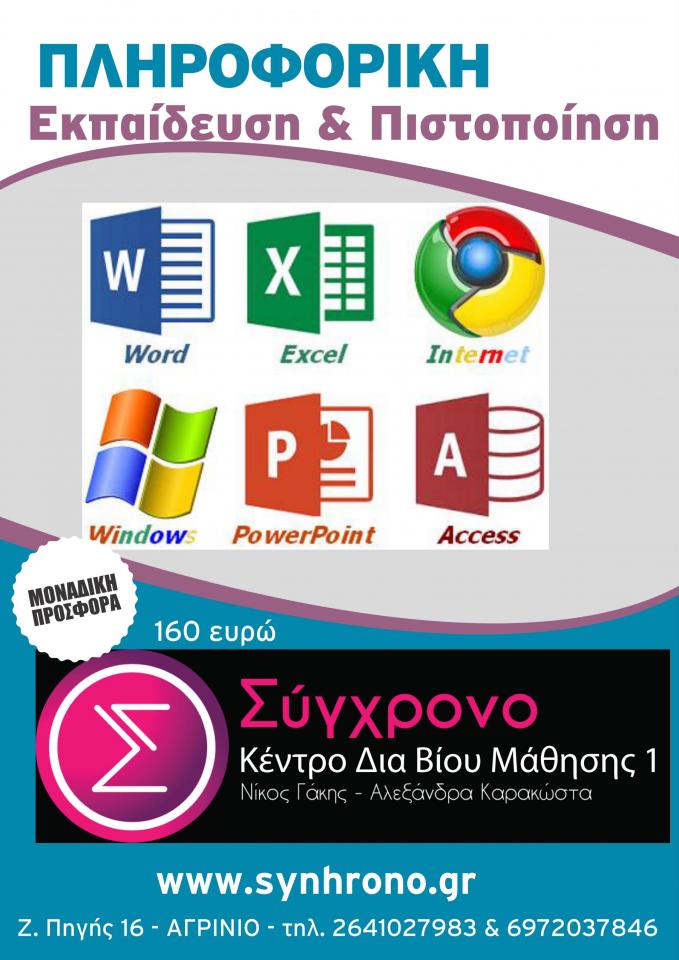 customer tabsΕπικοινωνίαΚΕΝΤΡΟ ΞΕΝΩΝ ΓΛΩΣΣΩΝ ΚΑΙ ΔΙΑ ΒΙΟΥ ΜΑΘΗΣΗΣΑΓΓΛΙΚΑ - ΙΣΠΑΝΙΚΑ - ΙΤΑΛΙΚΑ - ΡΩΣΙΚΑ - ΠΛΗΡΟΦΟΡΙΚΗΠροετοιμασία για όλα τα πτυχίαΛειτουργούν τμήματα παιδικά και ενηλίκωνΣπουδές σε Κύπρο & Μ. ΒρετανίαΚέντρα Ξένων ΓλωσσώνΕκπαίδευσηΖωοδόχου Πηγής 16, ΑγρίνιοΑΓΡΙΝΙΟ ΑΙΤΩΛΟΑΚΑΡΝΑΝΙΑΣΑΙΤΩΛΟΑΚΑΡΝΑΝΙΑΣΤΕΡΕΑ ΕΛΛΑΔΑ 2641027983 69720378462641039148info@synhrono.grwww.synhrono.grhttps://www.facebook.com/synchronogakis/ Το προτείνω (έχει προταθεί 0 φορές) ΦωτογραφίεςΠροσφορές ΠΛΗΡΟΦΟΡΙΚΗ - ΕΚΠΑΙΔΕΥΣΗ & ΠΙΣΤΟΠΟΙΗΣΗ ΜΟΝΟ ΜΕ 160 ΕΥΡΩFacebook LikeShare on FacebookTweet Widget